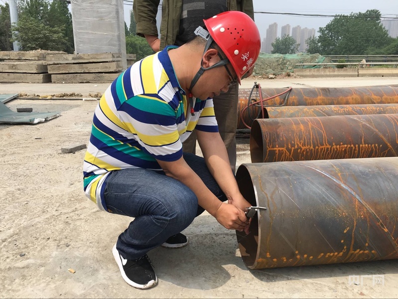 2018年,王健在阜陽北路二標滁河干渠橋,測量鋼管樁壁厚(央廣網(wǎng)發(fā) 安徽建工路橋供圖)
