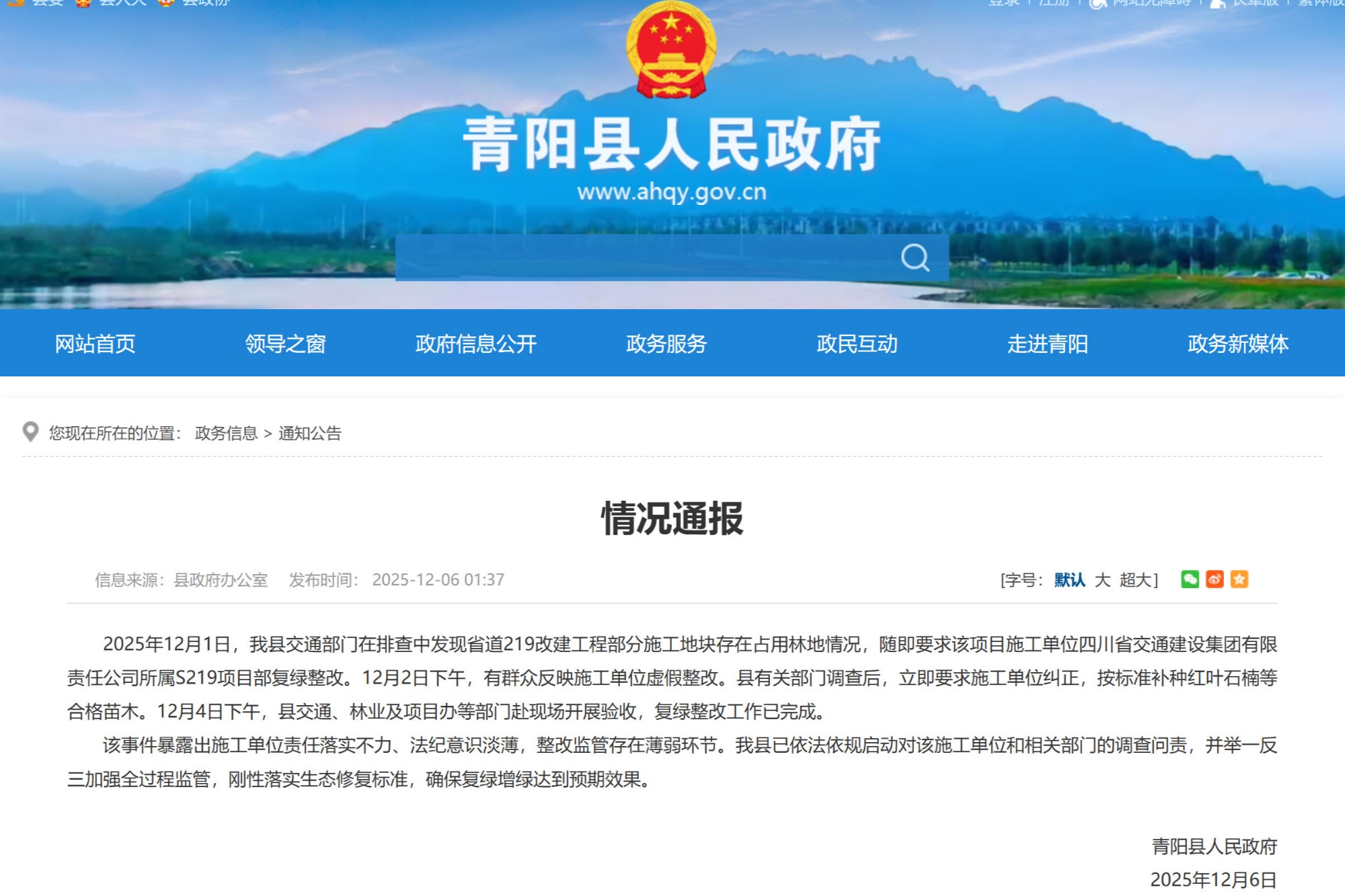 青陽縣已依法依規(guī)啟動對該施工單位和相關(guān)部門的調(diào)查問責(zé)。