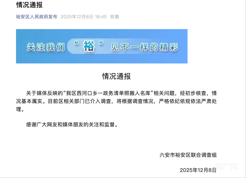 央廣網(wǎng)六安12月8日消息(記者 劉暢司晨)12月8日,安徽六安市裕安區(qū)聯(lián)合調(diào)查組針對(duì)“該區(qū)西河口鄉(xiāng)一政務(wù)清單照搬人名庫”相關(guān)問題發(fā)布情況通報(bào)。