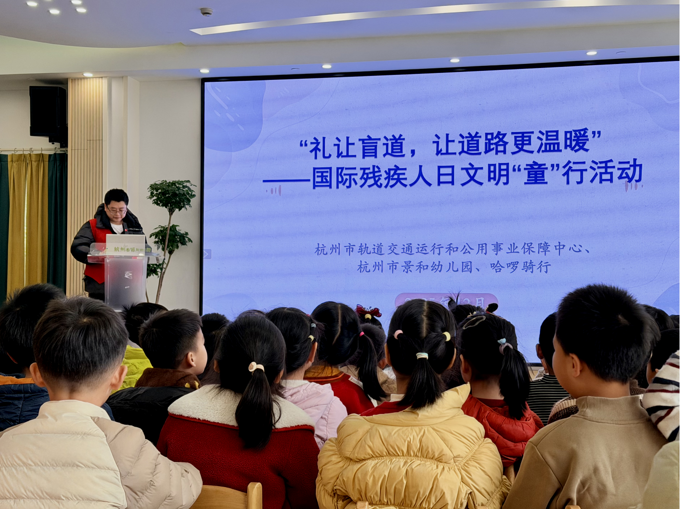 12月3日,浙江省杭州市景和幼兒園(鳳起園區(qū))音樂廳內(nèi)暖意融融,一場以 “禮讓盲道,讓道路更溫暖” 為主題的國際殘疾人日公益活動溫馨啟幕。本次活動由杭州市軌道交通運行和公用事業(yè)保障中心主辦,杭州市景和幼兒園與哈啰騎行聯(lián)合承辦,通過 “小手拉大手” 的形式,讓孩子們在互動體驗中學(xué)習(xí)盲道知識,踐行文明理念。