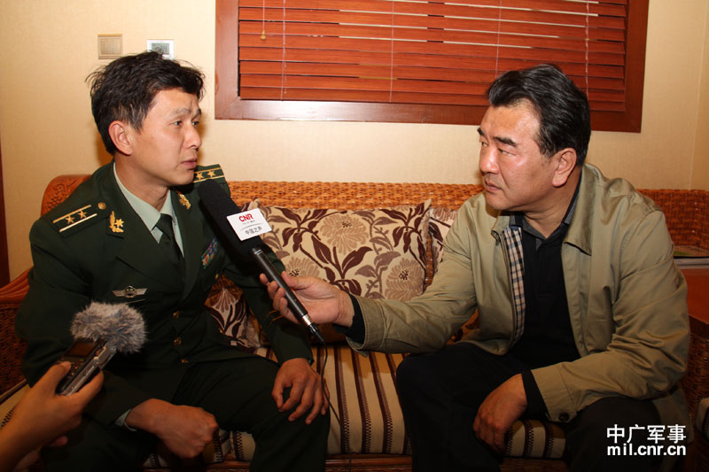 報道團記者王求采訪武警交通部隊二總隊五支隊總工程師陳順先 中廣軍事記者劉鵬攝