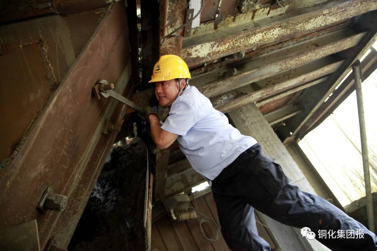 下了皮帶廊,走到主井礦倉(cāng)下,老郭自豪地指著頭頂上方:“8個(gè)漏斗,過(guò)去維修和更換都是委外,現(xiàn)在都是我?guī)俗约焊伞《嗌馘X我不曉得,自己的事情就該自己干,能省一個(gè)是一個(gè)!”說(shuō)到興奮時(shí),他還掏出手機(jī)上圖片給我講2個(gè)月前他們打的一場(chǎng)硬仗:主井35米礦倉(cāng)漏斗因礦石提運(yùn)沖擊導(dǎo)致四邊混凝土嚴(yán)重磨損,礦業(yè)公司聽(tīng)取老郭的建議,準(zhǔn)備為漏斗四邊安裝4塊鋼板以保護(hù)受損的混凝土墻體。為了最大限度減少對(duì)主井出礦的影響,只給他們48小時(shí)的停產(chǎn)時(shí)間。頭一次接這大活的老郭也沒(méi)犯怵,提前準(zhǔn)備好鋼板、木條等材料,將8名維修工分成3班,白班和小夜班清漏斗、制作安裝安全護(hù)板、鑲嵌鋼板,大夜班專門焊接鋼板??辛?天的方便面,提前2小時(shí)完工將漏斗交付使用……