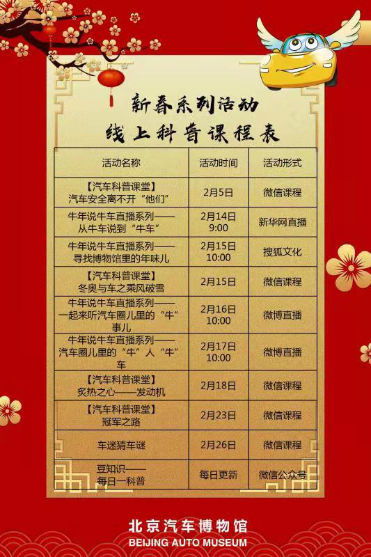 據(jù)北京汽車博物館相關(guān)負(fù)責(zé)人介紹,初三至初六以“牛年說牛車”為主題,每天一場(chǎng)直播講述汽車圈兒里的“!避、牛人、牛事兒。初三,科普老師講帶領(lǐng)大家從古代的牛車講到現(xiàn)在的“!避;初四,汽車博物館工作人員將帶領(lǐng)大家尋找汽博館里的年味兒,逛一逛博物館里的新春文創(chuàng)節(jié);初五,講解員以角色扮演的方式為大家?guī)硪粓?chǎng)情景式講解;初六,以新年特展“那些年,在路上”為主線帶大家看一看各個(gè)年代的經(jīng)典車型,聊一聊汽車圈兒里的“!比恕芭!笔聝。