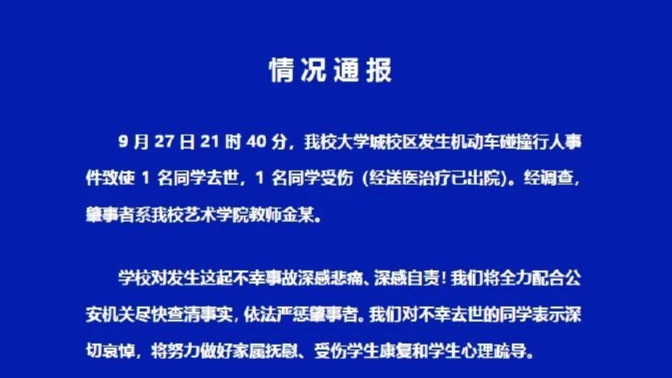 華南理工大學(xué)通報(bào)“校內(nèi)發(fā)生車禍致1死1傷”:肇事者系學(xué)校教師,將全力配合公安機(jī)關(guān)盡快查清事實(shí),依法嚴(yán)懲肇事者