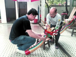 師徒二人在制作龍舟頭