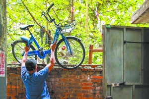 隨后,他們發(fā)現(xiàn),一堵高約2米的圍墻之內(nèi)雜草叢生,幾十輛共享單車被丟過圍墻。三人借來長梯,爬上高墻,將一輛輛車托舉出來,用了2個(gè)小時(shí)才從“救出”12輛小藍(lán)單車,其中4輛已無法騎行。淑芬一一將車輛的問題標(biāo)注,并上傳故障,隨后將12輛車騎回或推回濱江東路的停車點(diǎn)。