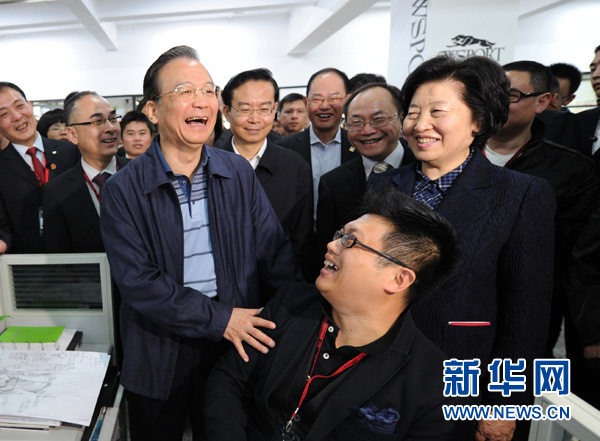 4月1日至3日,中共中央政治局常委、國務(wù)院總理溫家寶在廣西欽州,福建泉州、莆田、福州等地就經(jīng)濟運行情況進行調(diào)研。這是4月2日,溫家寶在泉州七匹狼體育用品公司考察時與員工親切交談。 新華社記者馬占成攝