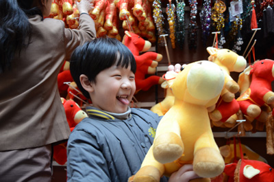 1月15日,一個孩子正在選購馬年玩偶。即將到來的農(nóng)歷馬年,讓“馬”成了年貨市場的主角,各種“馬上有!、“馬上發(fā)財”、“馬到成功”等寓意美好愿望的玩偶、擺件十分暢銷。 本報記者 史晶 攝