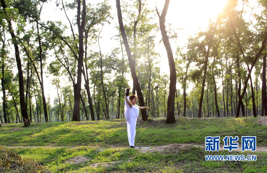 6月19日,瑜伽愛好者在內(nèi)黃縣萬畝槐林內(nèi)練習(xí)瑜伽。