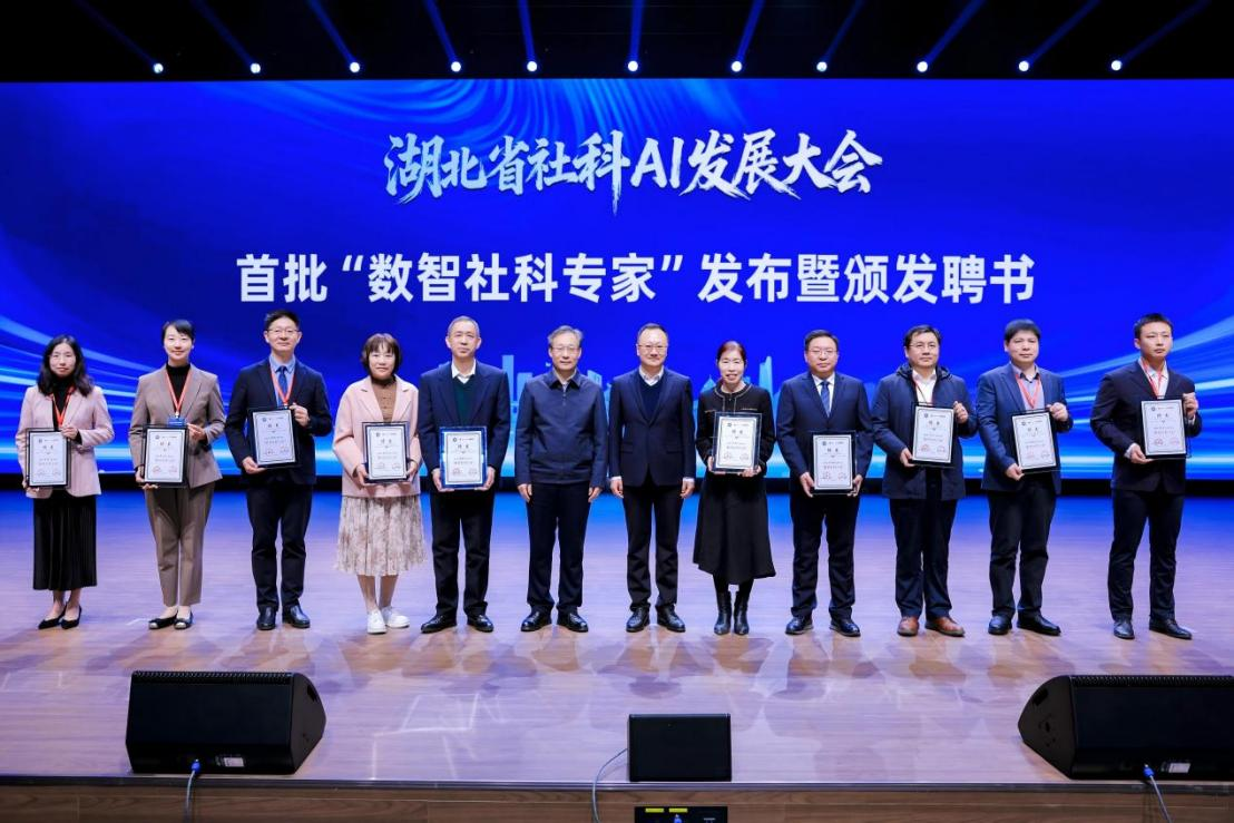 與會嘉賓為湖北首批“數(shù)智社科專家”頒發(fā)聘書(央廣網(wǎng)發(fā) 湖北省社科聯(lián)供圖)
