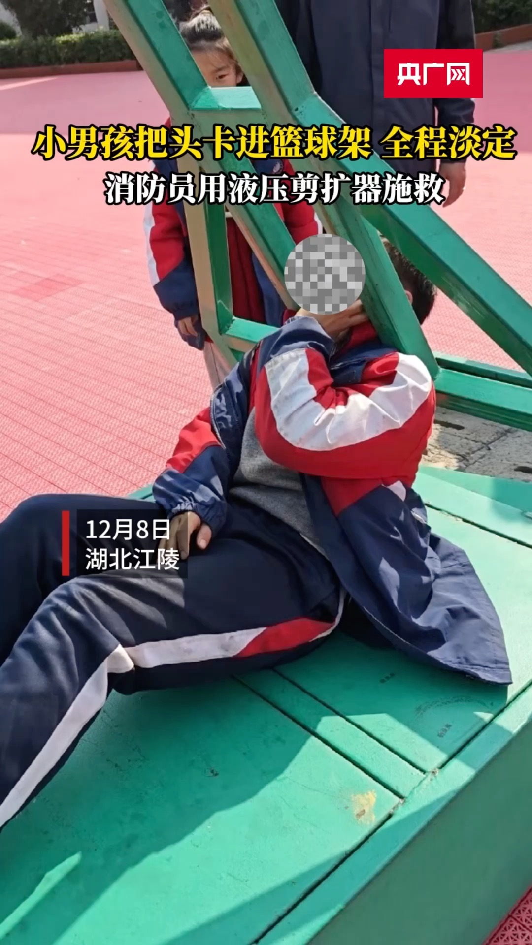 2月8日,荊州市江陵縣一名12歲的六年級學生在操場玩耍時,不慎將頭卡進籃球架,越動卡得越緊。當?shù)叵来箨牻拥角缶入娫捄,立即派出專業(yè)救援人員,借助液壓擴張剪將籃球架撐開,成功救出小男孩。