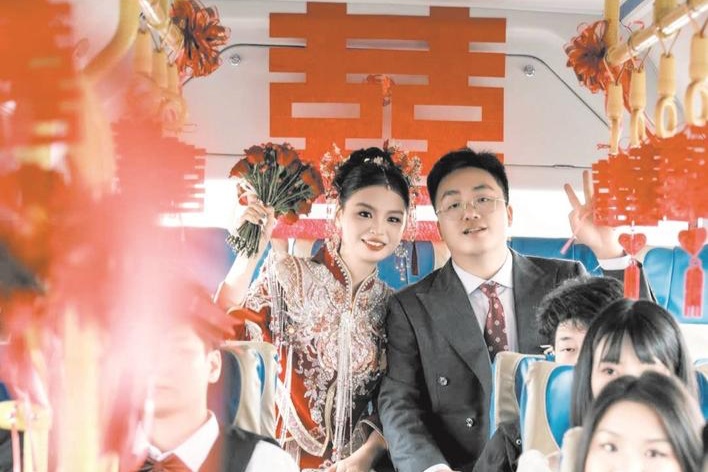 10月2日上午8時30分,天門市一輛寫有“小曹小方的婚車”標識的公交車亮相街頭,駛向接親目的地,成為一道亮麗的風景線。路人紛紛拿出手機記錄下這美好的一刻,為新人送上真摯的祝福。