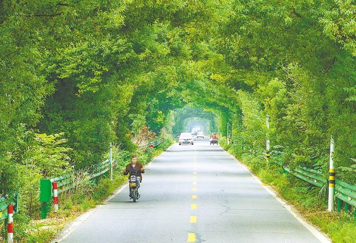 10月11日,武漢市蔡甸區(qū)侏洪路約4公里長的鄉(xiāng)間道上,路兩側(cè)的香樟樹枝葉相互交錯,自然勾勒出一座蔥郁的“森林隧道”,行走其間,仿若置身于綠色仙境,感受一路清涼。