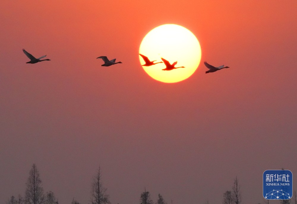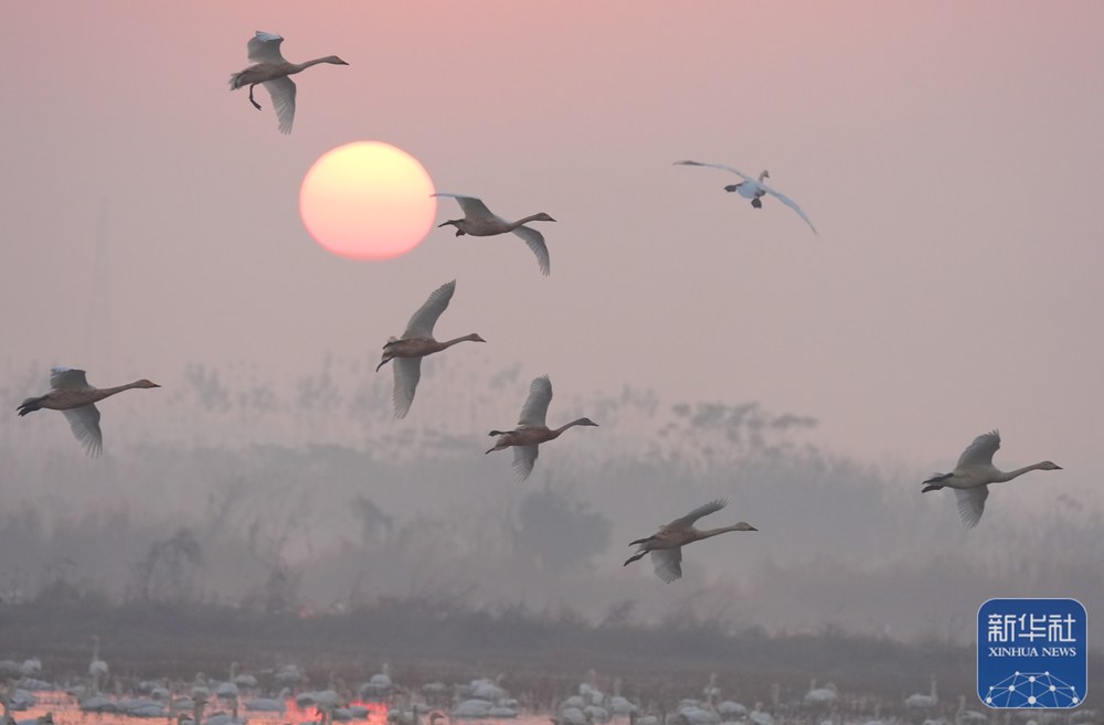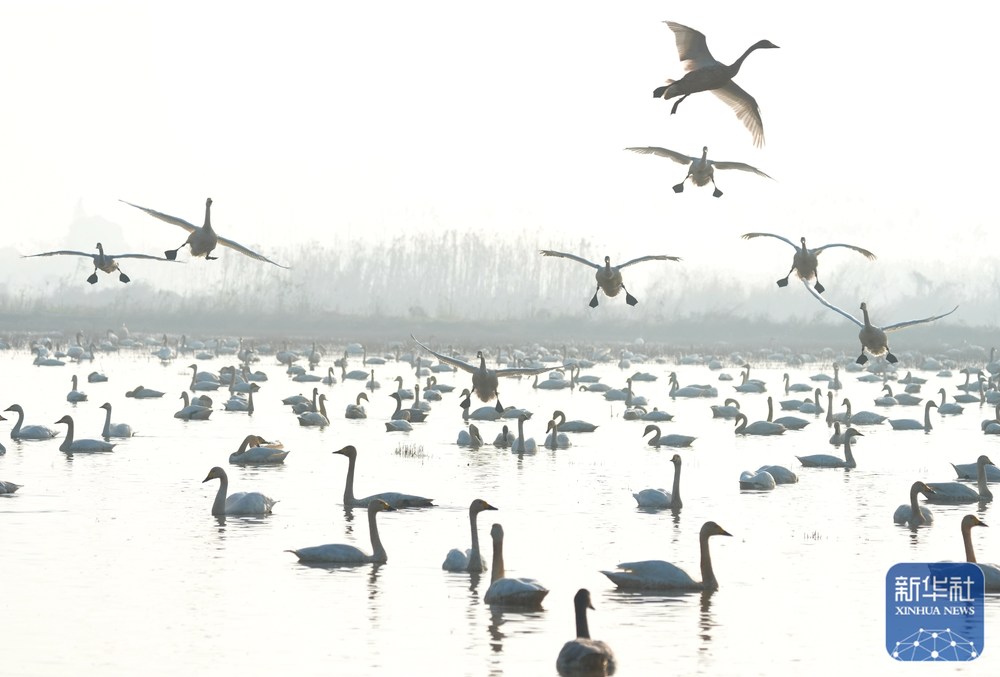 12月6日,小天鵝在湖南省岳陽市屈原管理區(qū)東古湖濕地上空飛翔。