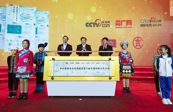 2018年12月23日下午,中央廣播電視總臺(tái)、教育部、國(guó)家語(yǔ)委聯(lián)合舉辦“中小學(xué)語(yǔ)文示范誦讀庫(kù)”第二季作品發(fā)布會(huì)。中宣部副部長(zhǎng)、中央廣播電視總臺(tái)臺(tái)長(zhǎng)慎海雄,教育部副部長(zhǎng)、國(guó)家語(yǔ)委主任杜占元,中央廣播電視總臺(tái)副臺(tái)長(zhǎng)閻曉明出席發(fā)布會(huì),并共同見(jiàn)證第二批100篇音頻教材正式上線發(fā)布。 新華社記者沈伯韓 攝