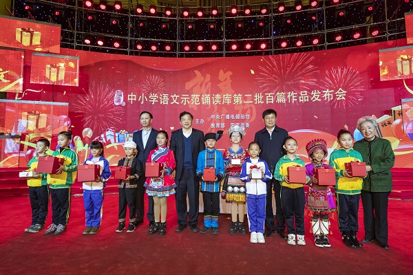 2018年12月23日下午,中央廣播電視總臺(tái)、教育部、國(guó)家語(yǔ)委聯(lián)合舉辦“中小學(xué)語(yǔ)文示范誦讀庫(kù)”第二季作品發(fā)布會(huì)。中宣部副部長(zhǎng)、中央廣播電視總臺(tái)臺(tái)長(zhǎng)慎海雄,教育部副部長(zhǎng)、國(guó)家語(yǔ)委主任杜占元,中央廣播電視總臺(tái)副臺(tái)長(zhǎng)閻曉明出席發(fā)布會(huì),并共同見(jiàn)證第二批100篇音頻教材正式上線發(fā)布。新華社記者沈伯韓 攝