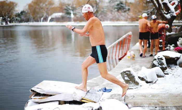 雪后,冬泳愛(ài)好者開(kāi)始享受別樣的冬泳快樂(lè)。