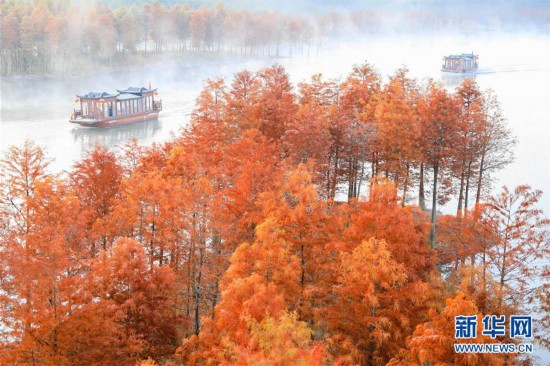 11月28日,游人乘船在江蘇省盱眙縣“水上森林”景區(qū)內游覽。進入冬季,位于江蘇中部的淮安市盱眙縣天泉湖“水上森林”景區(qū)色彩斑斕,在景區(qū)游覽,游人可體驗“人在畫中游”的美感。 新華社發(fā)(周海軍攝)
