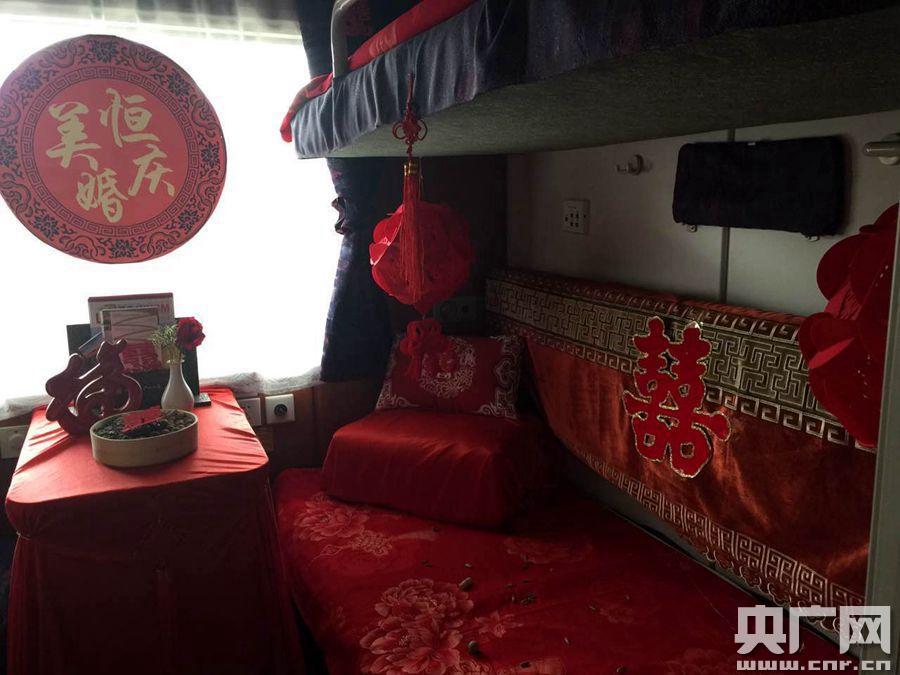 “我們?cè)谖⑿派峡匆娗岸稳兆舆@趟車上舉辦過婚禮,覺得這樣的婚禮挺個(gè)性、挺有紀(jì)念意義的,我們就商量在‘5·20’這個(gè)特別的日子里用特別的方式來記錄我們的青春。”談及在列車上舉行婚禮,看著用列車包房裝扮得古色古香的婚房,新郎小張掀起了新娘的紅蓋頭。