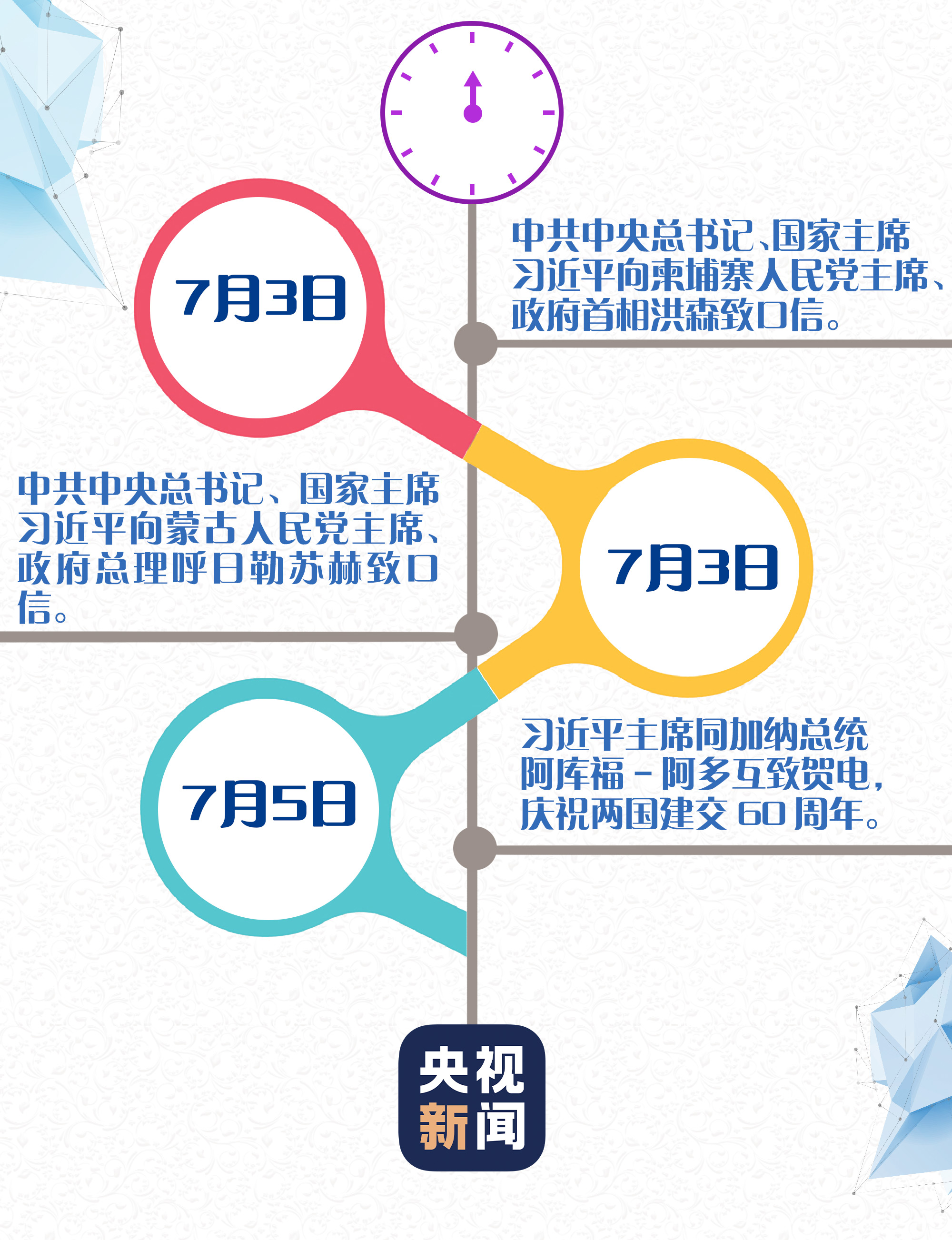 7月3日,中共中央總書記、國家主席習近平向柬埔寨人民黨主席、政府首相洪森致口信。同一天,中共中央總書記、國家主席習近平向蒙古人民黨主席、政府總理呼日勒蘇赫致口信。