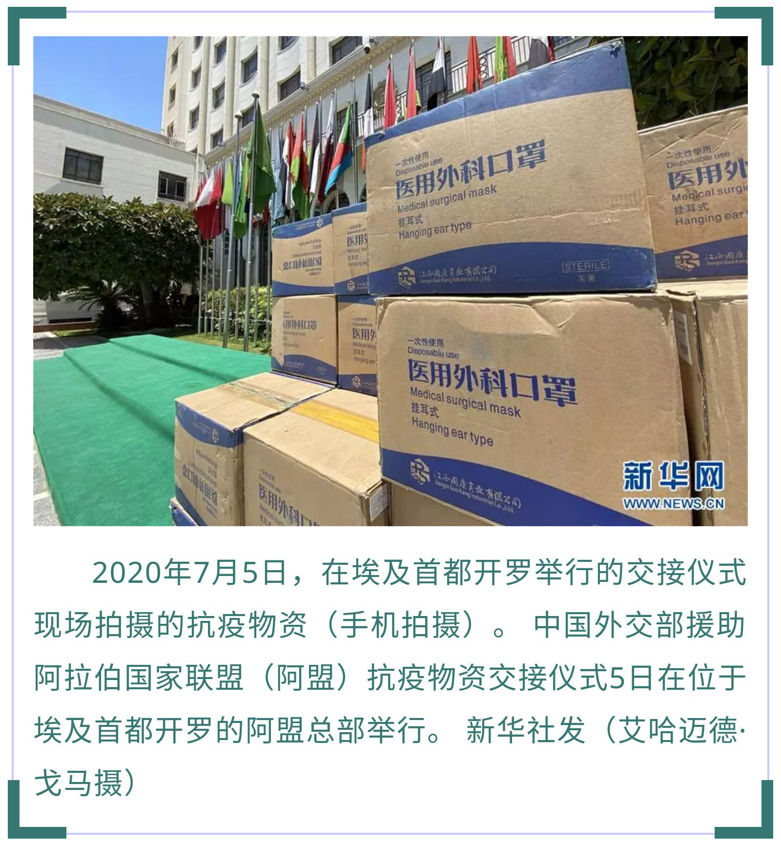 7月5日,中國外交部援助阿盟抗疫物資交接儀式在開羅舉行。中國駐埃及大使廖力強代表中國外交部向阿盟副秘書長胡薩姆·扎基移交了防護口罩。據(jù)廖力強介紹,新冠疫情暴發(fā)以來,中方向阿拉伯國家援助了大量物資,毫無保留地向阿拉伯國家分享抗疫經(jīng)驗和技術,同21個阿拉伯國家舉辦了衛(wèi)生專家視頻會議,向8個阿拉伯國家派遣了醫(yī)療組,同時協(xié)助阿拉伯國家在中國采購抗疫物資,支持阿拉伯國家有序復工復產(chǎn)。