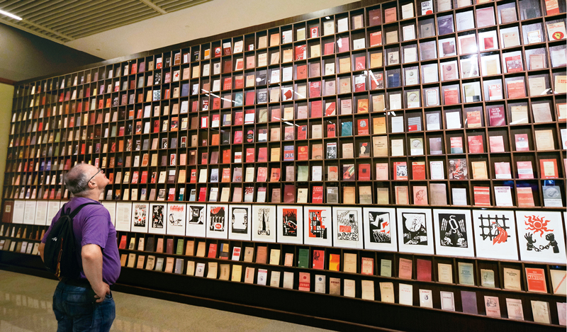 △2018年5月9日,一位外國觀眾被北京“真理的力量——紀(jì)念馬克思誕辰200周年主題展覽”中一面展示不同國家出版的500多種《共產(chǎn)黨宣言》的書墻所吸引。