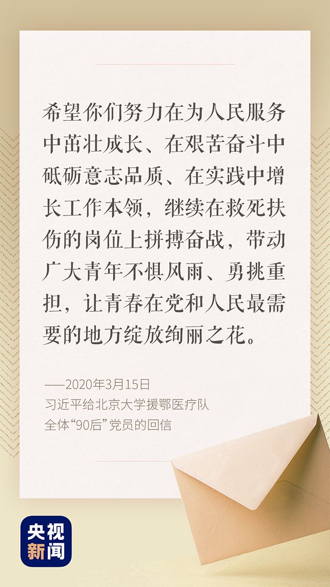 3月15日,習(xí)近平總書(shū)記給北京大學(xué)援鄂醫(yī)療隊(duì)全體“90后”黨員回信,向他們和奮斗在疫情防控各條戰(zhàn)線上的廣大青年致以誠(chéng)摯的問(wèn)候。