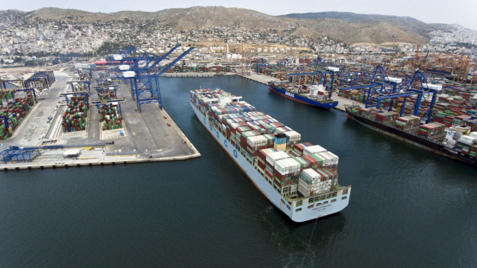 這是2017年5月7日,中遠海運的貨船駛出比雷埃夫斯港(比港)集裝箱碼頭。 新華社發(fā)(帕諾斯·托馬達基斯 攝)