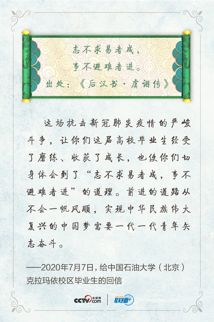 “這場抗擊新冠肺炎疫情的嚴峻斗爭,讓你們這屆高校畢業(yè)生經(jīng)受了磨練、收獲了成長,也使你們切身體會到了‘志不求易者成,事不避難者進’的道理。前進的道路從不會一帆風順,實現(xiàn)中華民族偉大復(fù)興的中國夢需要一代一代青年矢志奮斗。”