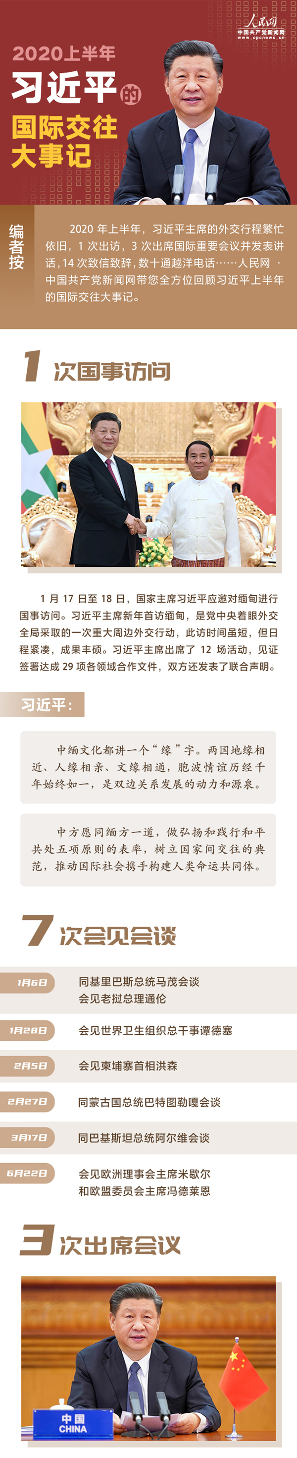 細數(shù)今年上半年,習(xí)近平夙夜在公,勤勉工作,不斷刷新“忙碌指數(shù)”:數(shù)十次出席重要會議部署各項工作,8次國內(nèi)考察,調(diào)研足跡遍及7省區(qū)市,3次出席國際重要會議并發(fā)表講話,20余次致信、回信海內(nèi)外人士,60次就疫情防控等話題與40余位外國政要和國際組織負責(zé)人通電話……人民網(wǎng)·中國共產(chǎn)黨新聞網(wǎng)推出系列圖解報道,帶您全方面回顧習(xí)近平的2020上半年。