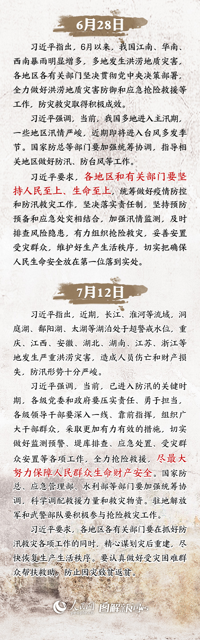 面對(duì)嚴(yán)峻的防汛形勢,習(xí)近平總書記高度重視,于6月28日和7月12日先后兩次對(duì)防汛救災(zāi)工作作出重要指示!叭嗣裰辽稀⑸辽稀,習(xí)近平要求各部門堅(jiān)持把確保人民群眾生命財(cái)產(chǎn)安全放在首位,落實(shí)責(zé)任,狠抓隱患排查,強(qiáng)化應(yīng)急預(yù)案,進(jìn)一步加強(qiáng)監(jiān)測預(yù)警、聯(lián)防聯(lián)動(dòng),為當(dāng)前防汛搶險(xiǎn)救災(zāi)工作指明了方向。