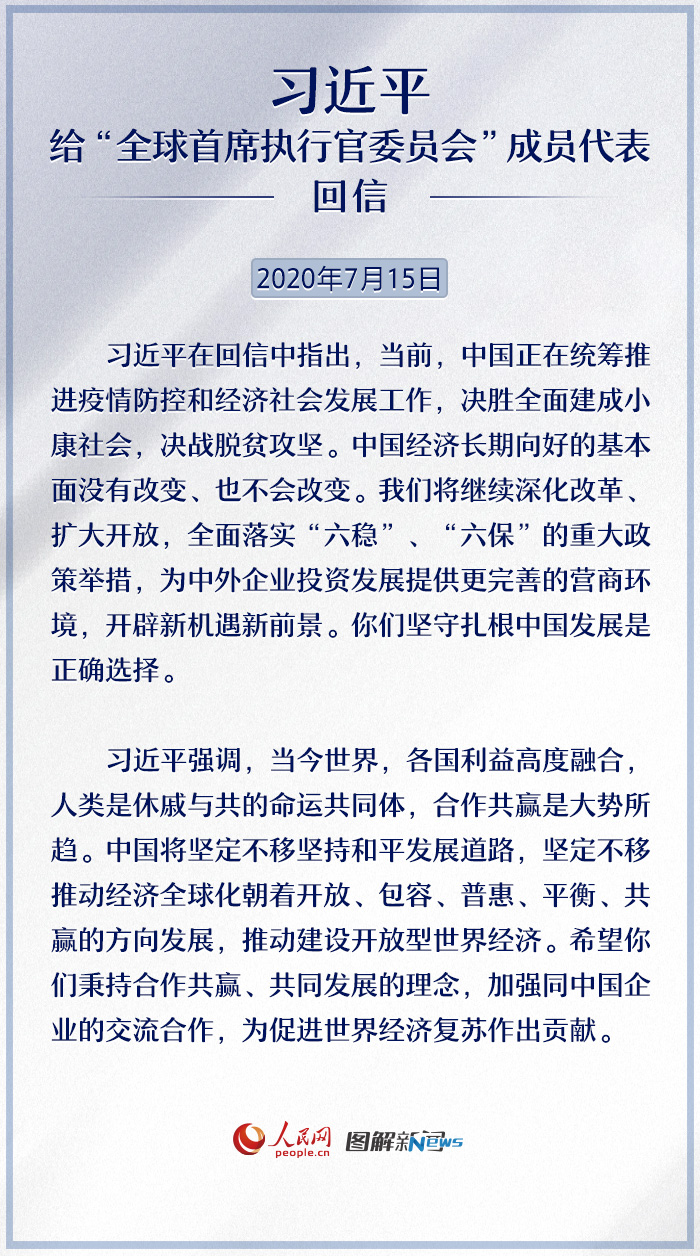 7月15日,國家主席習(xí)近平給“全球首席執(zhí)行官委員會”成員代表回信,贊賞他們對中國和平發(fā)展、開放發(fā)展的堅定信心和繼續(xù)扎根中國的承諾,以及對中國經(jīng)濟發(fā)展提出的建設(shè)性建議。