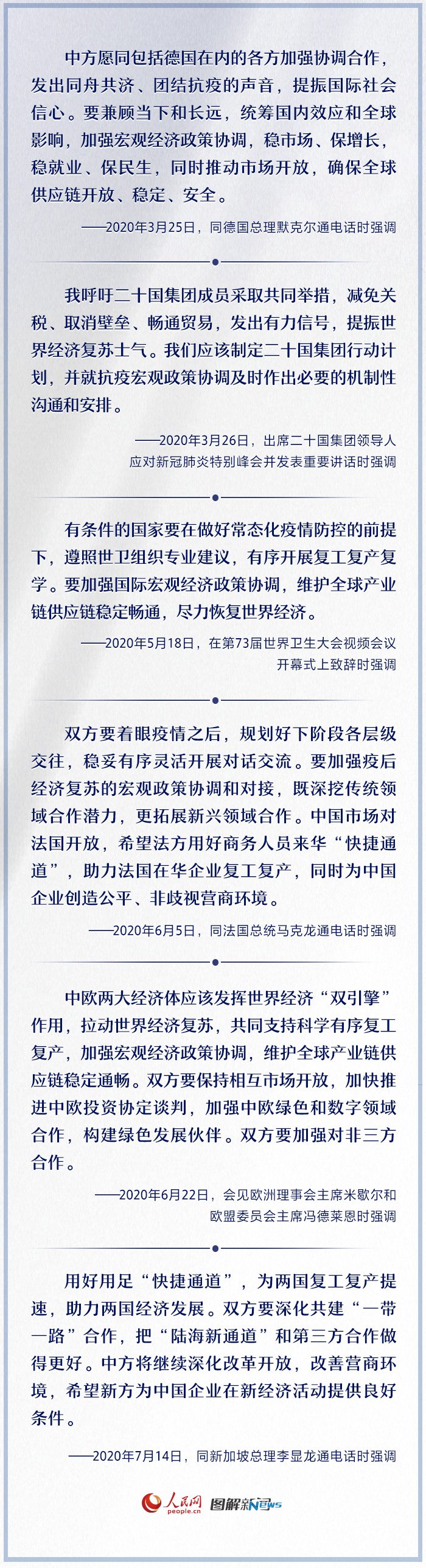 “推動建設(shè)開放型世界經(jīng)濟”,這是自新冠疫情發(fā)生以來,習(xí)近平為世界經(jīng)濟復(fù)蘇開出的一劑“良方”。在多個重要外交場合,習(xí)近平積極呼吁“各國應(yīng)該聯(lián)手加大宏觀政策對沖力度”“減免關(guān)稅、取消壁壘、暢通貿(mào)易”,并積極推動重點項目及新業(yè)態(tài)合作,表明了中國愿與國際社會一道應(yīng)對疫情挑戰(zhàn)的堅定決心。
