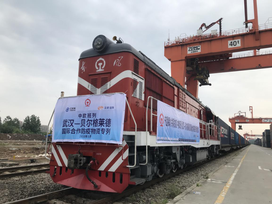 2020年5月9日上午10時,滿載3500立方米、294.42噸國際合作防疫物資的75041次中歐班列,從中國鐵路武漢局集團公司吳家山站開出,駛往塞爾維亞共和國首都貝爾格萊德,支援塞爾維亞及周邊國家抗擊新冠肺炎疫情。宋英輝 攝