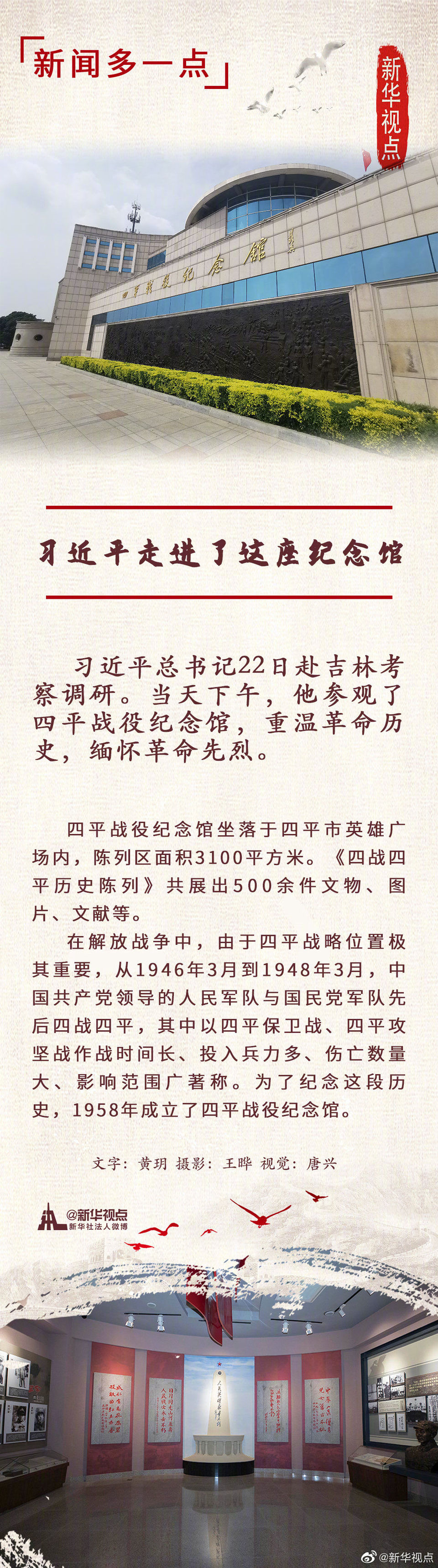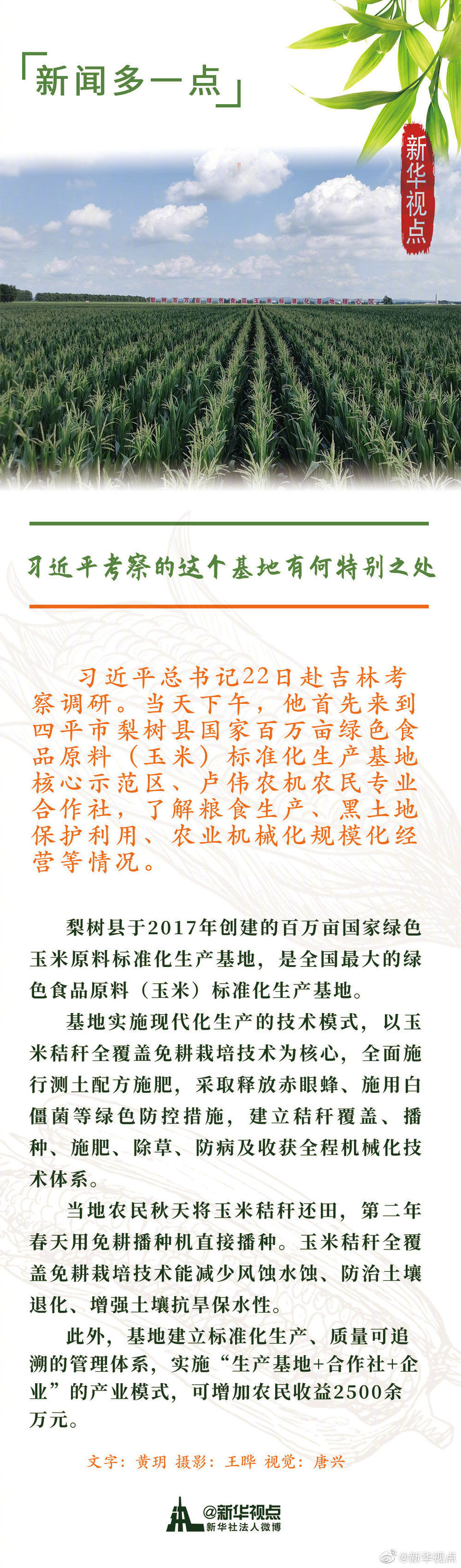 習(xí)近平總書記22日赴吉林考察調(diào)研。當(dāng)天下午,他首先來到四平市梨樹縣國家百萬畝綠色食品原料(玉米)標準化生產(chǎn)基地核心示范區(qū)、盧偉農(nóng)機農(nóng)民專業(yè)合作社,了解糧食生產(chǎn)、黑土地保護利用、農(nóng)業(yè)機械化規(guī);(jīng)營等情況。隨后,習(xí)近平參觀了四平戰(zhàn)役紀念館,重溫革命歷史,緬懷革命先烈。(記者張曉松、朱基釵 攝影: 鞠鵬、王曄、燕雁)