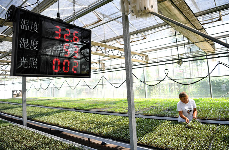 ▲2020年7月24日,河北省邢臺市任澤區(qū)一家育苗基地的工人在育苗溫室管理蔬菜秧苗。