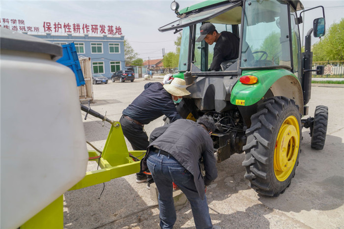 △在吉林省四平市梨樹縣康達(dá)農(nóng)機(jī)農(nóng)民專業(yè)合作社,農(nóng)民在調(diào)試免耕播種機(jī)。