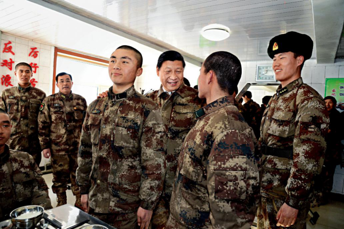 2014年1月26日,習(xí)近平主席在內(nèi)蒙古軍區(qū)邊防某團(tuán)一連食堂,親切地拍著新兵劉博陽(前左一)、余兵(前左三)的肩膀,詢問他們是哪里人,連隊(duì)飯菜是否可口