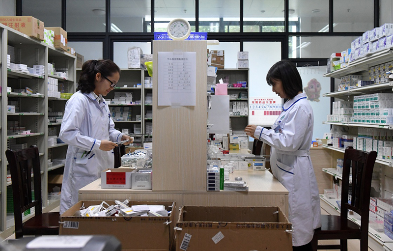 在廣西南寧市第四人民醫(yī)院,兩名醫(yī)務(wù)人員在藥房工作。