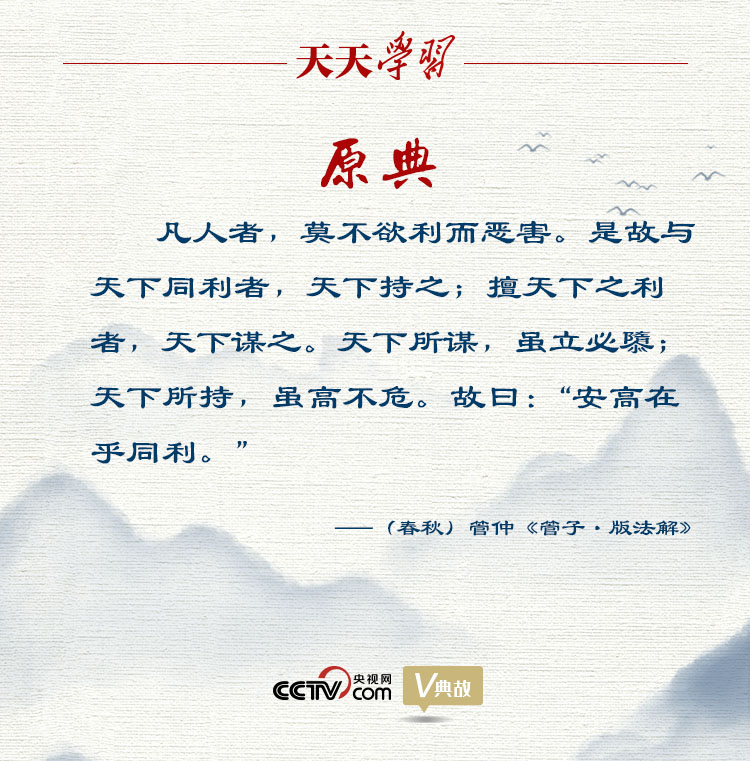 “利民”是管子民本思想的重要內(nèi)容。管子認(rèn)為,“得人之道,莫如利之”,強(qiáng)調(diào)治國者必須善于與民同利。他從人的自然本性加以闡述,“凡人者,莫不欲利而惡害”,認(rèn)為趨利避害是人的本能。因此,“與天下同利者,天下持之;擅天下之利者,天下謀之”。與天下人同利的,天下人就擁護(hù)他;獨(dú)占天下人利益的,天下人就圖謀他。管子的上述觀點(diǎn)是對姜尚“同天下之利者,則得天下;擅天下之利者,則失天下”思想的繼承。