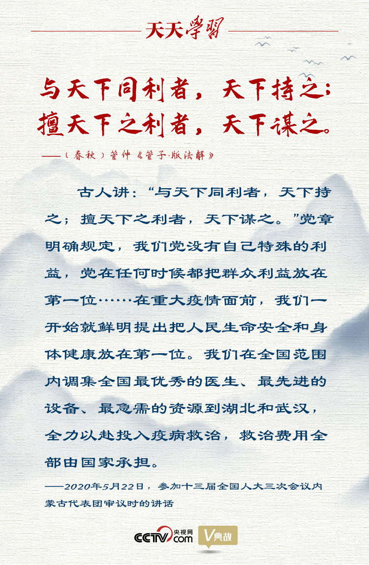 “不惜一切代價(jià)!”2020年5月22日,習(xí)近平總書記參加十三屆全國人大三次會議內(nèi)蒙古代表團(tuán)審議,在談及保護(hù)人民生命安全和身體健康時擲地有聲地說。他在此引用了“與天下同利者,天下持之;擅天下之利者,天下謀之”這句古語,強(qiáng)調(diào)我們黨沒有自己特殊的利益,黨在任何時候都把群眾利益放在第一位。這是我們黨作為馬克思主義政黨區(qū)別于其他政黨的顯著標(biāo)志。