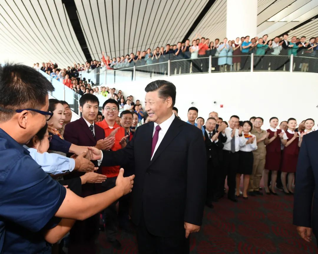 2019年9月25日,北京大興國(guó)際機(jī)場(chǎng)投運(yùn)儀式在北京舉行。中共中央總書(shū)記、國(guó)家主席、中央軍委主席習(xí)近平出席儀式,宣布機(jī)場(chǎng)正式投運(yùn)并巡覽航站樓。這是習(xí)近平看望參與機(jī)場(chǎng)建設(shè)和運(yùn)營(yíng)的工作人員代表,同他們親切交談。新華社記者 謝環(huán)馳 攝