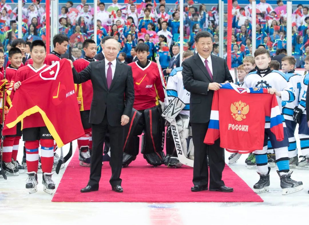 2018年6月8日,國(guó)家主席習(xí)近平同俄羅斯總統(tǒng)普京在天津體育館共同觀看中俄青少年冰球友誼賽。兩國(guó)元首同小隊(duì)員們親切交談、合影,并共同為比賽開(kāi)球。新華社記者 龐興雷 攝