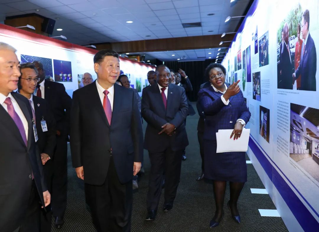 2018年7月24日,國(guó)家主席習(xí)近平和南非總統(tǒng)拉馬福薩在比勒陀利亞一道出席中南科學(xué)家高級(jí)別對(duì)話會(huì)開(kāi)幕式。這是開(kāi)幕式前,習(xí)近平和拉馬福薩共同參觀中南科技創(chuàng)新合作成果圖片展。新華社記者 謝環(huán)馳 攝