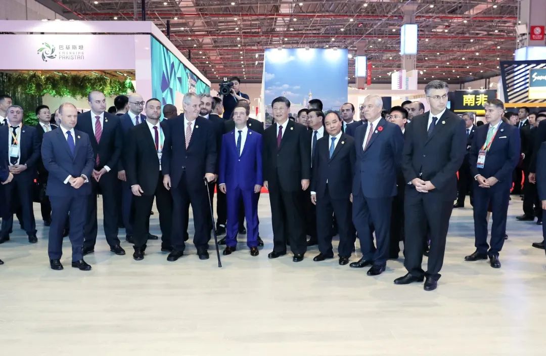 2018年11月5日,國(guó)家主席習(xí)近平在上海同出席首屆中國(guó)國(guó)際進(jìn)口博覽會(huì)的外國(guó)領(lǐng)導(dǎo)人共同巡館。新華社記者 謝環(huán)馳 攝