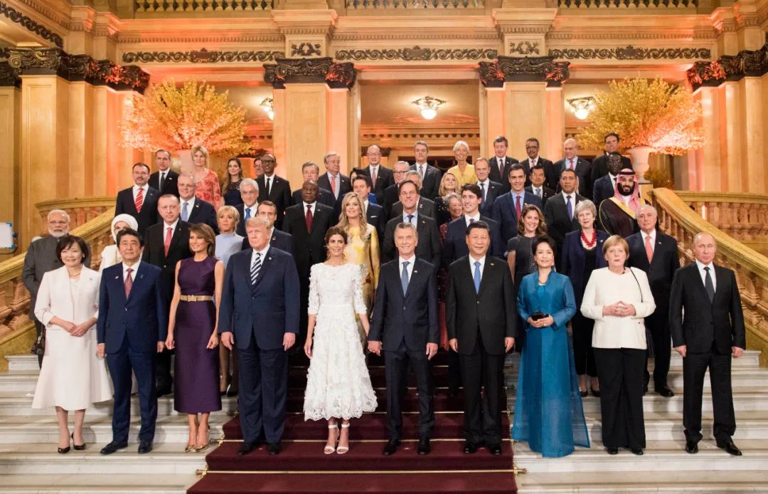 2018年11月30日,二十國(guó)集團(tuán)領(lǐng)導(dǎo)人第十三次峰會(huì)在阿根廷布宜諾斯艾利斯舉行。這是當(dāng)晚,國(guó)家主席習(xí)近平和夫人彭麗媛同出席峰會(huì)的各代表團(tuán)團(tuán)長(zhǎng)夫婦集體合影。新華社記者 李學(xué)仁 攝