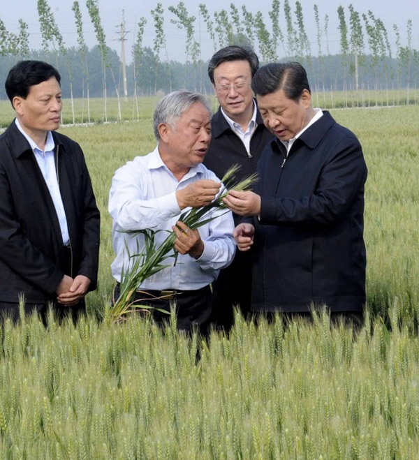 △2014年5月9日下午,習近平總書記來到河南省尉氏縣張市鎮(zhèn),走進一片高標準糧田,看麥穗灌漿,問農田建設。