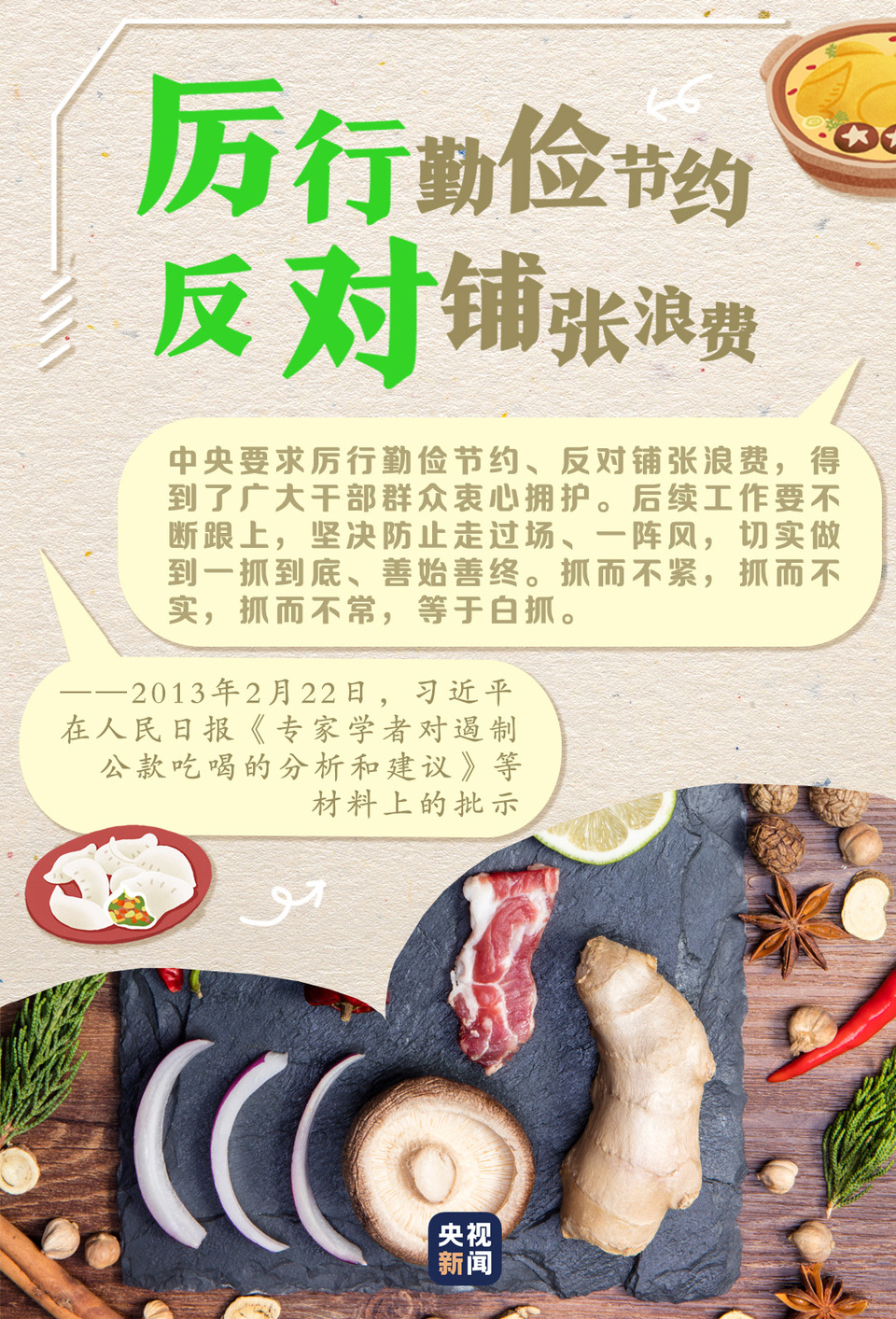 “要采取針對性、操作性、指導性強的舉措,加強監(jiān)督檢查,鼓勵節(jié)約,整治浪費! 2013年1月17日,習近平在新華社《網民呼吁遏制餐飲環(huán)節(jié)“舌尖上的浪費”》的材料上作出批示。