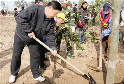 2007年2月28日,習近平在杭州錢江新城副陽臺景觀綠化工程現(xiàn)場參加義務植樹活動