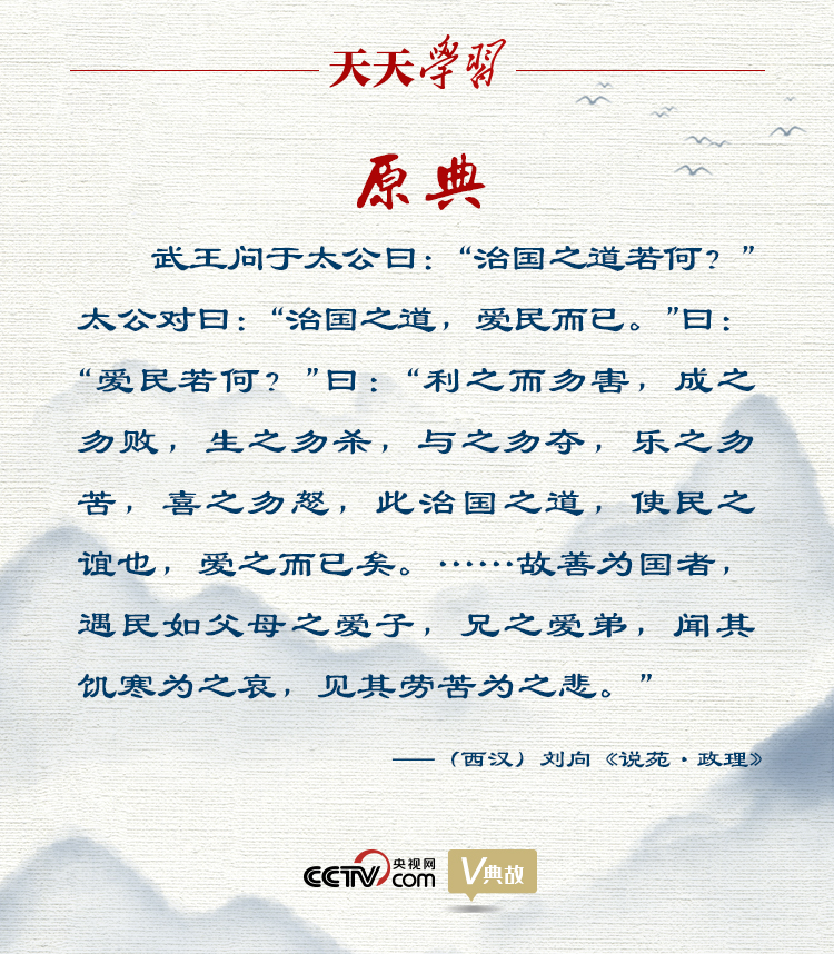 西漢經(jīng)學(xué)家劉向在《說苑·政理》中講述了這樣一個(gè)故事:三千多年前,周武王向姜太公詢問治國方法,太公答道:“治國之道,愛民而已!苯又司蛺勖穹绞椒椒▎栴}進(jìn)行了深入探討。最后太公總結(jié)道:“善為國者,遇民如父母之愛子,兄之愛弟,聞其饑寒為之哀,見其勞苦為之悲!睘閲褐卫韲;遇:對待。意思是,善于治理國家的人,對待百姓就像父母愛護(hù)子女、兄長愛護(hù)弟弟一樣,聽到他們挨凍受餓就感到哀傷,看到他們勞苦不堪就感到悲痛!